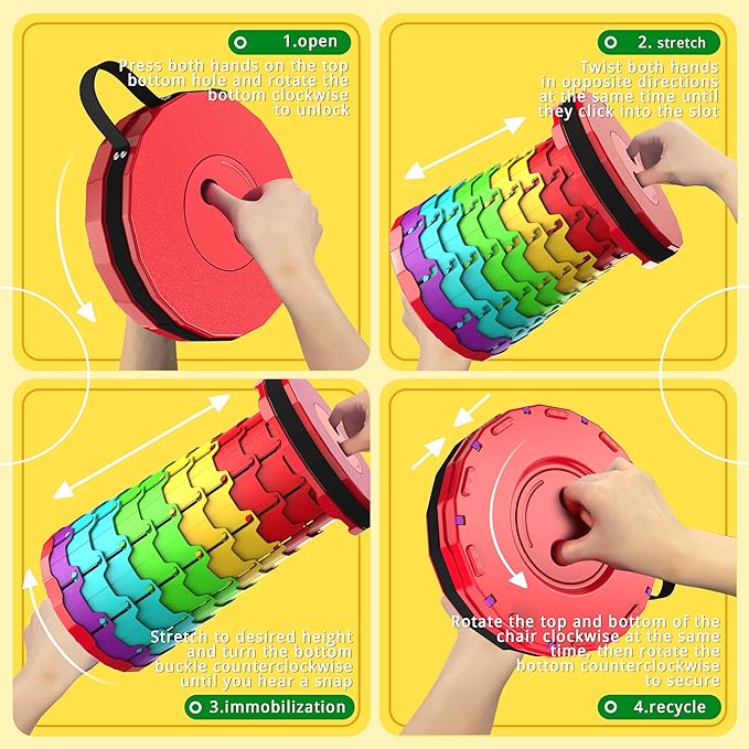 Retractable Folding Stool – A lightweight, portable, height‑adjustable seat designed for indoor and outdoor use, featuring a colorful, collapsible structure that folds into a compact disc for easy carrying.